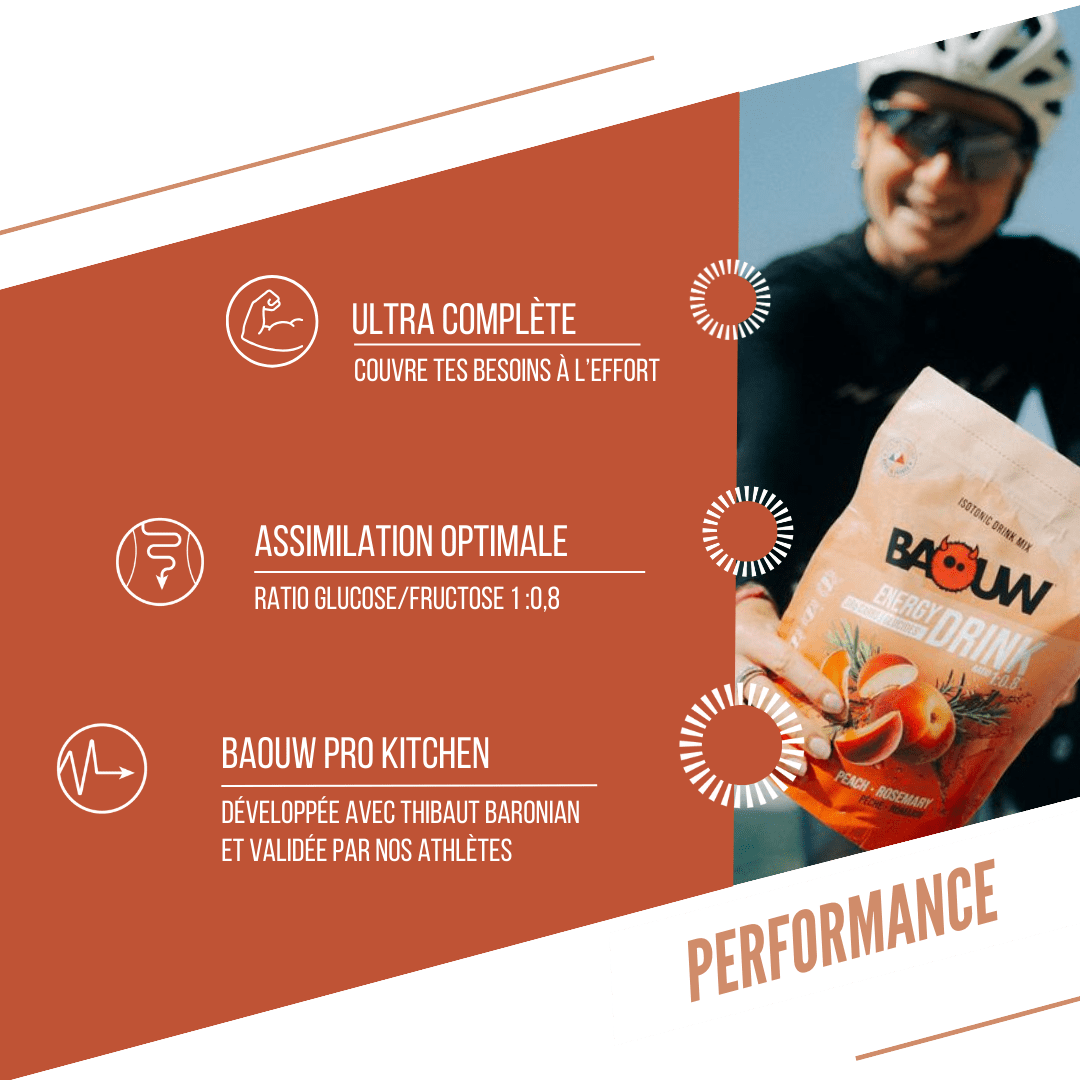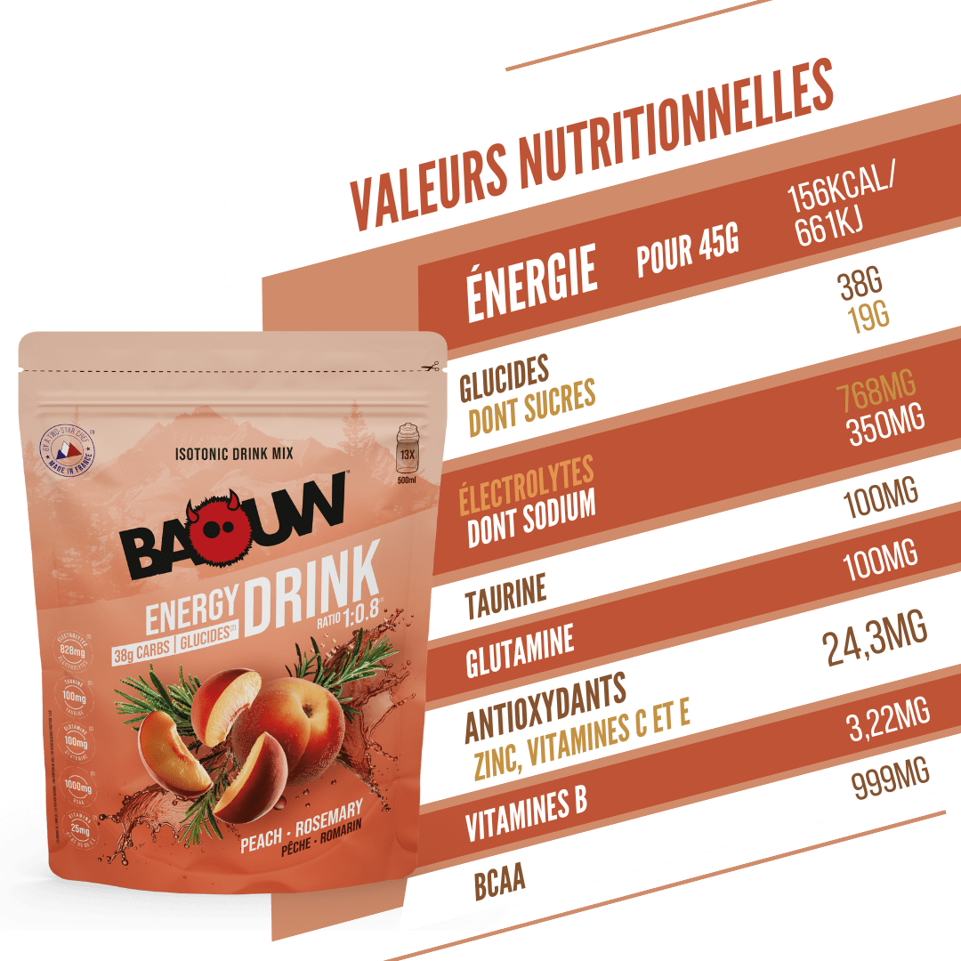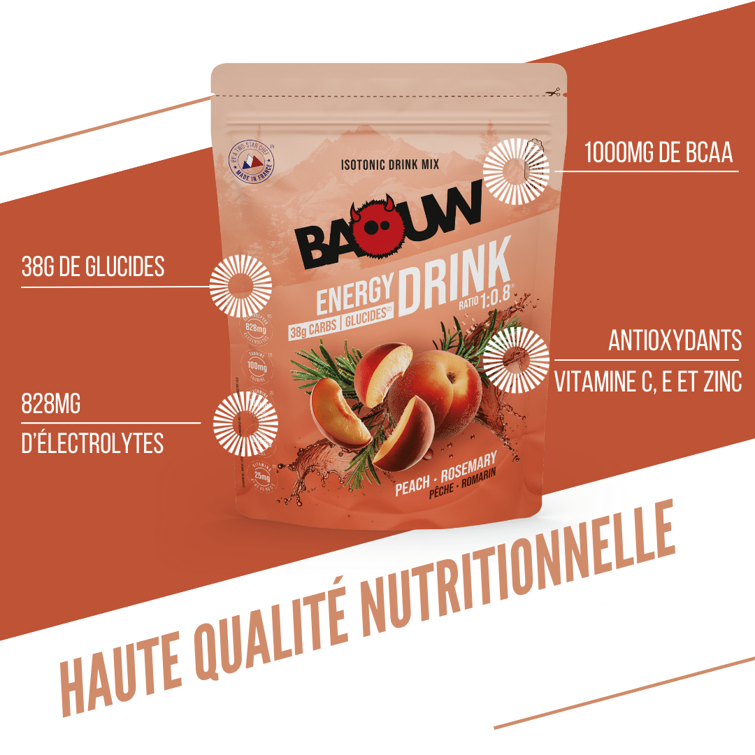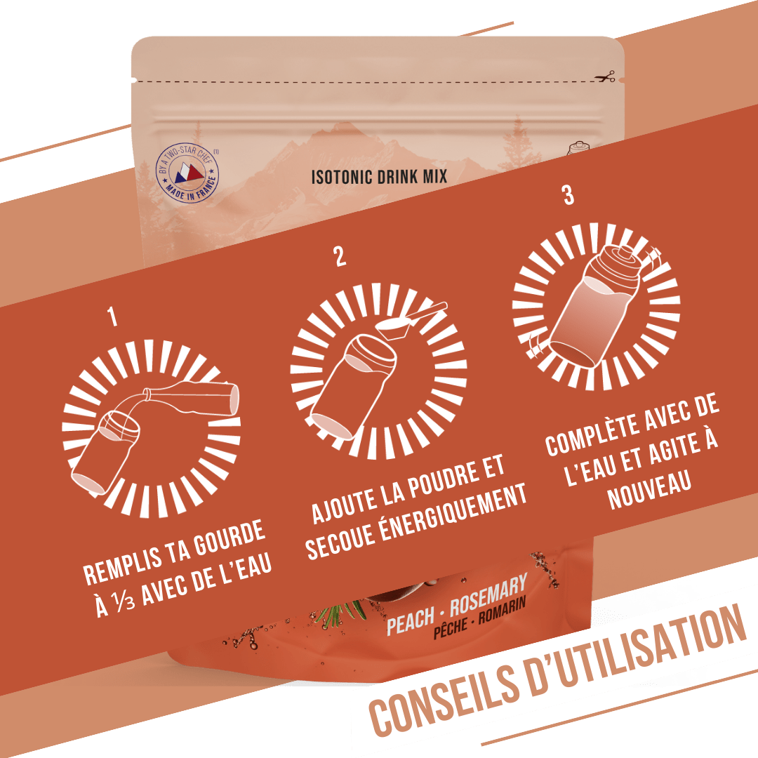 The isotonic Peach Rosemary drink combines efficiency and pleasure. This ultra-complete formula, with no colorants or preservatives and made from selected organic ingredients, guarantees optimal absorption without digestive discomfort. Developed and tested by endurance athletes, it offers a fresh, light flavor, ideal for long outings and competitions alike.