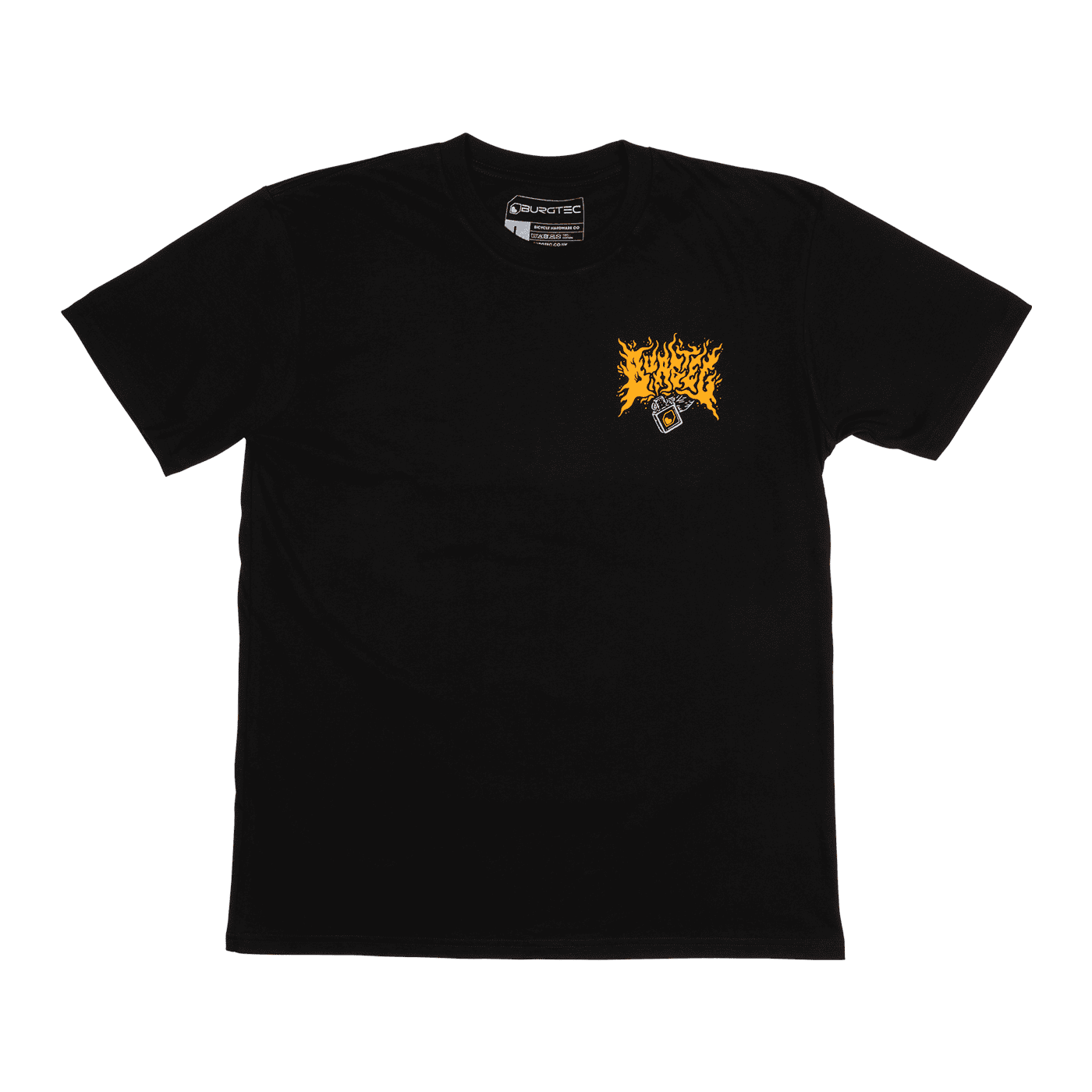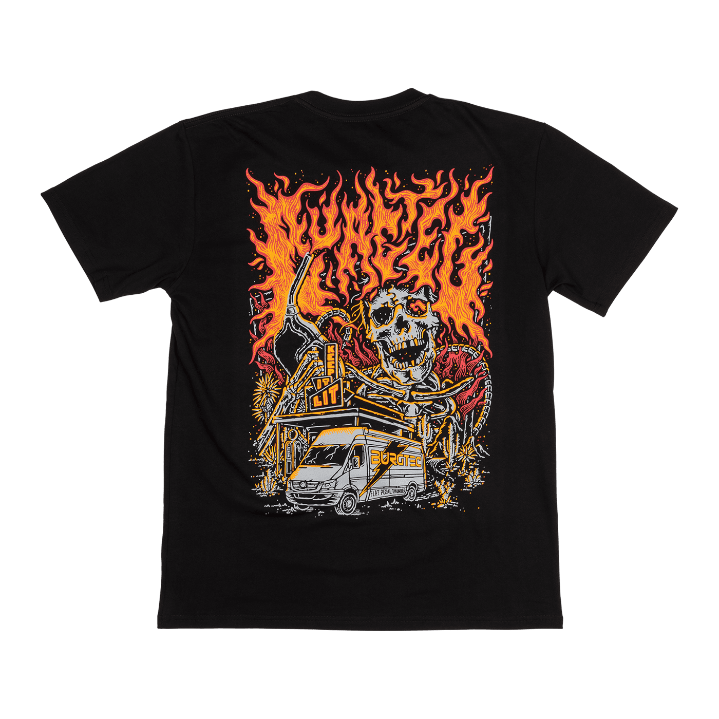 Fire up the trails with BURGTEC KEEP IT LIT T-Shirt. Its explosive 4-color print features a skeleton refueling the Burgtec OG van under a fiery sky - a bold design for riders who live it up. Made from breathable premium cotton, it ensures optimum comfort both during and after exertion. With its round collar and relaxed fit, it's the perfect T-shirt to assert your style, on or off the bike.