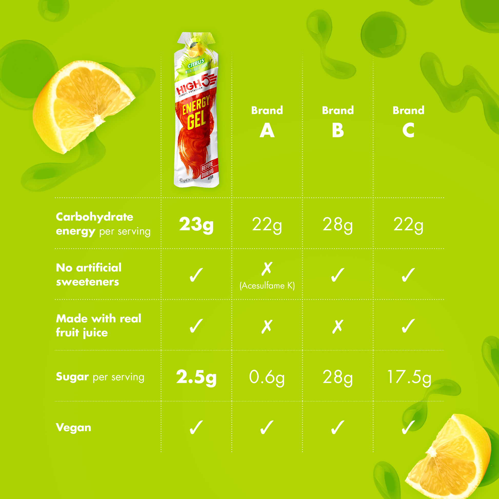 | Fast energy | 23 g of carbohydrates per gel → immediate action |