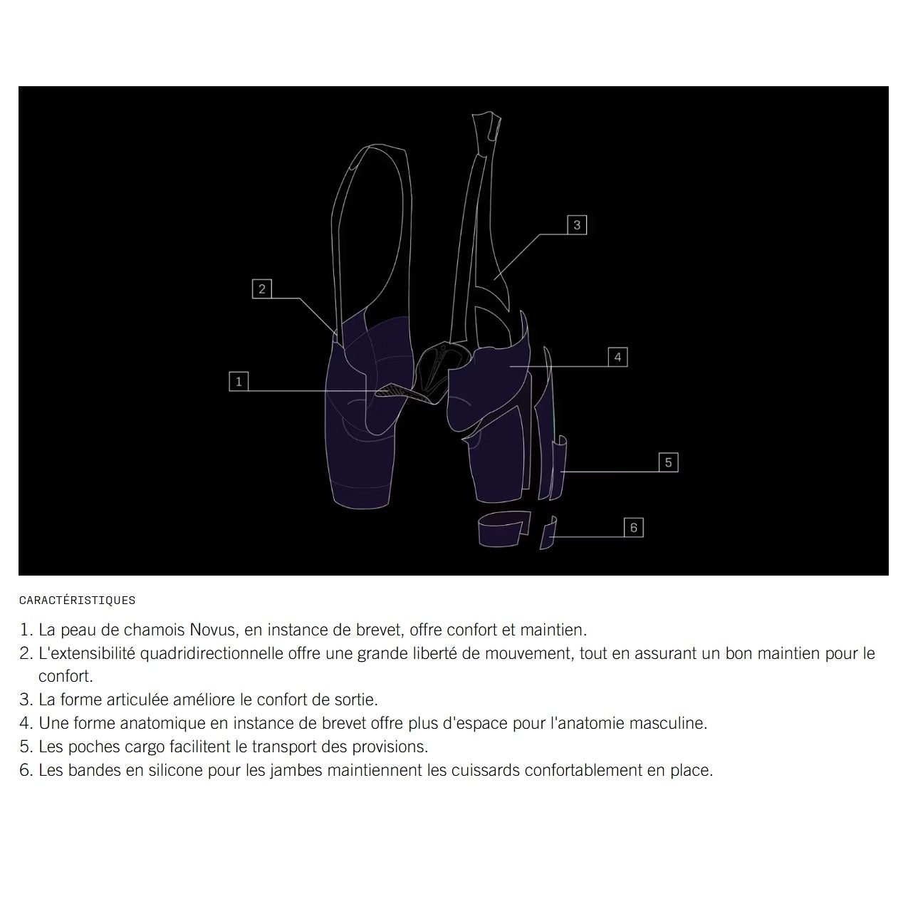 La peau de chamois Novus, en instance de brevet, est spécialement modelée pour répartir les points de pression et augmenter le confort sur la selle, grâce à des couches de rembourrage ciblées et un insert en gel. Elle améliore le confort même sur de longues distances, tandis que les bretelles élastiques et les coutures plates contribuent à un maintien stable sans irritation.