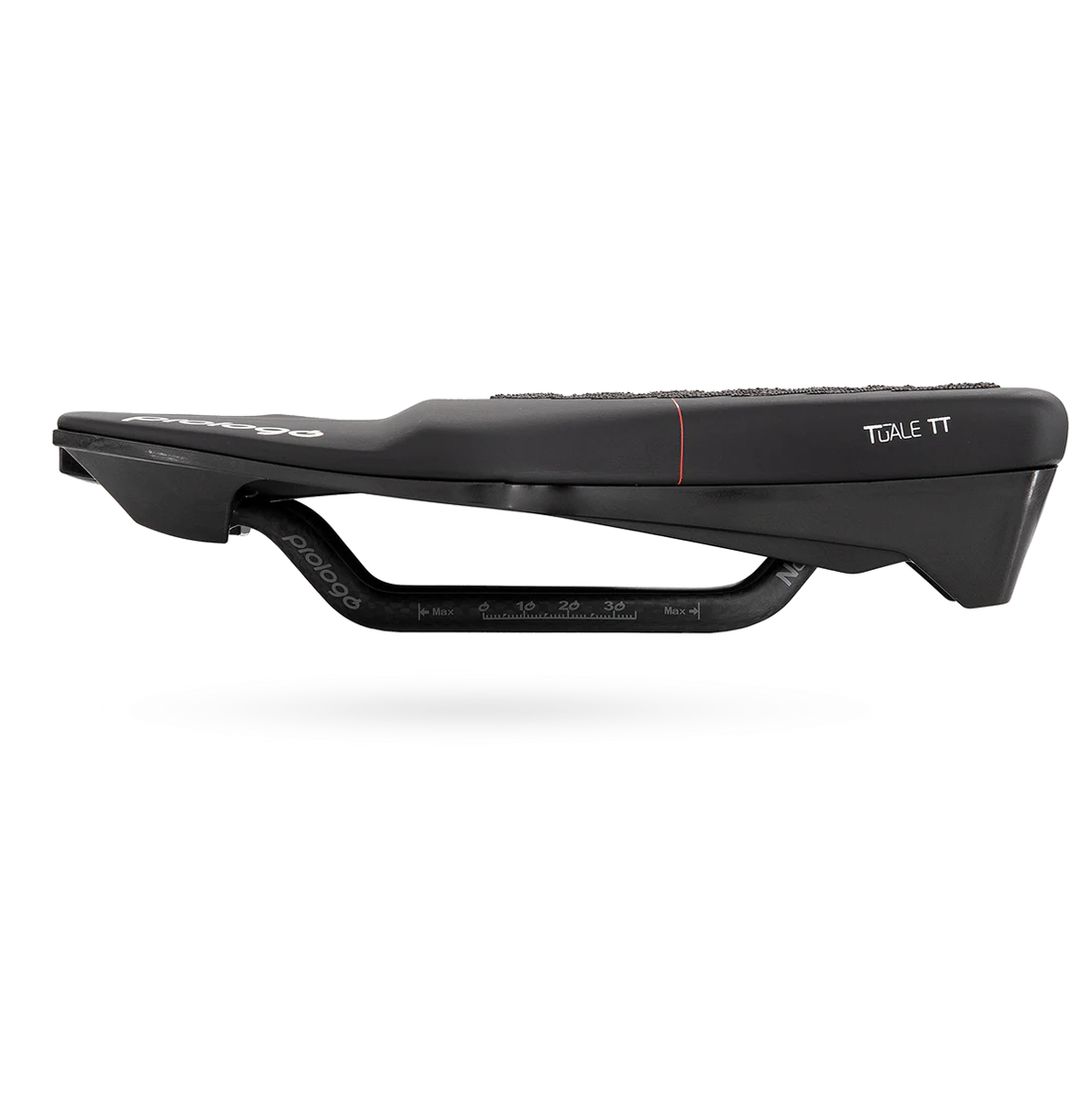 The anatomical shape of the Saddle is based on the observation that only the front part of the saddle is really stressed in the aerodynamic position. Prologo has therefore developed a structure with variable padding, thicker at the front (over 20 mm) for comfort and support, then thinner towards the rear, an area little used. The central channel makes the Saddle lighter and improves air penetration.