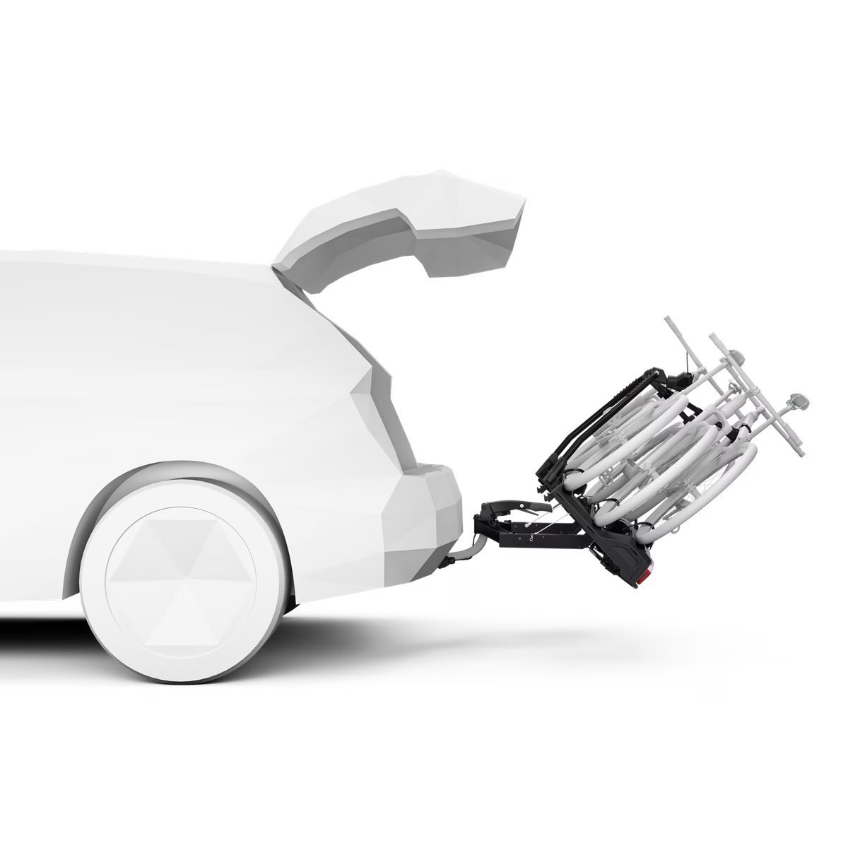The fastening system is designed to be both practical and secure, with independent arms and a rotating head equipped with sturdy straps that adapt to different frame sizes and shapes, including carbon frames. Ease of use is further enhanced by careful strap management, tool-free assembly and a tilting facility for trunk access even with bikes mounted.