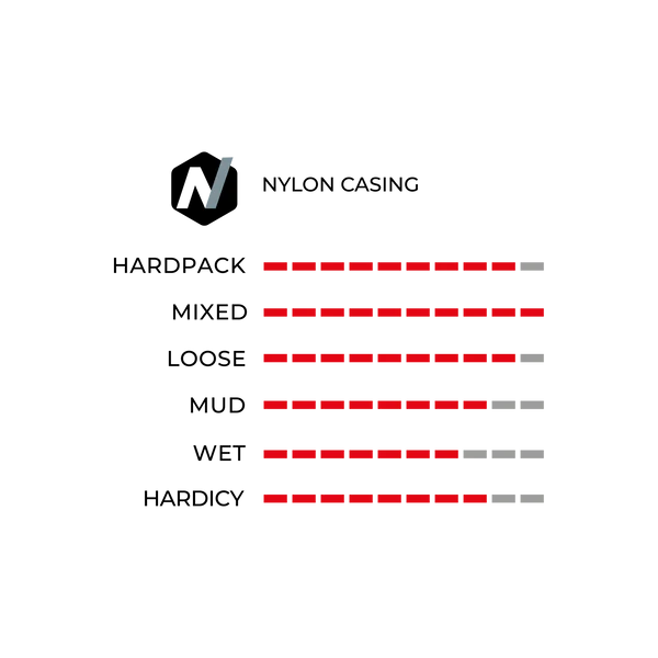 Its ingenious design combines alternating central studs for improved rolling speed, and motorcycle tire-inspired lateral studs for powerful grip when cornering. The specific grooving improves grip under lateral load, while the stud spacing ensures efficient evacuation of mud and debris.